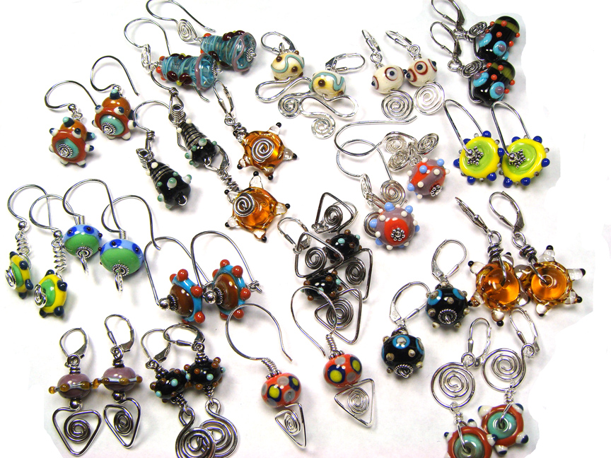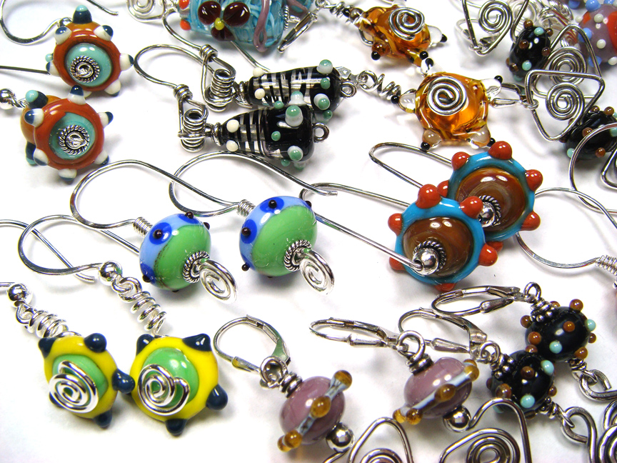 I’ve got tons of earrings to show you today. I am mailing these earrings off to Kim of k.t.’s creations. We worked on a collaboration together ~ she created the one-of-a-kind lampwork beads, and I turned them in to wire earrings. There’s quite a variety here: from hand wrought earwires to swirls with patina. I know I’m guilty of not working on earrings often enough. Now I need to make some to keep here in the sweet bead studio shop!