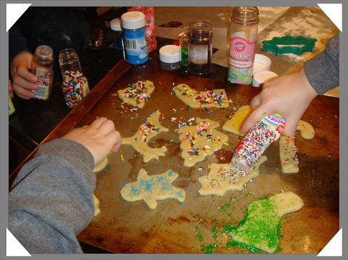 And last but not least, we ended the weekend with yet another family tradition: making sugar cookies! I remember when my Grandmother would come over at Christmas bearing tins of chocolate chip and sugar cookies (do you remember those great tins, they promised something wonderfully home baked inside!). I pulled out my special rolling pin that my Grandmother gave me around the holidays when I was in college. Three sets of helping hands sure make for a challenging evening of cut-out cookie baking, but it was worth it. And we only burned one batch.
