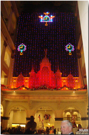 It was so interesting to read the stories about who created the Liberty Bell, how it cracked, and to see memorabilia from its travels across the country. As I’m sure you’ve guessed, we visited Philadelphia! During our brief visit, we visited what may be the largest Macy’s ever and happened upon an amazing Dicken’s Village where we could walk through the pages of “A Christmas Carol”…what a classic! There was also a light show in the cavernous, 12 story department store. We were there just in time to catch it. In the next photo you will see the world’s largest still-operating pipe organ with shoppers below. My husband was so impressed that he said he’d love to make a visit to Philadelphia an annual tradition around Christmas time.