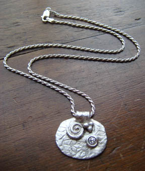 Dawn Fernald-Spruill was one of those instructors you knew you would like immediately. She just had that easy-going way about her that made you feel like you couldn’t possibly mess up what you were about to embark on. We were all relaxed in no time, playing with the silver clay like it was play-doh. Okay, I’ll admit we were all a bit nervous when it came to using the clay in the syringe form to create the bezel for the stone in the pendant. We learned about texturizing, kiln and torch firing, and creating a patina for the finished piece. One gal bought a finished cord in the bead shop just so she could walk out wearing her finished pendant. I loved the immediate satisfaction! Here are a few of the pendants that I made.