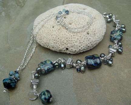 “Evening Tide” is a set using lampwork by Marilyn Jones in gorgeous shades of blue. The deep blue has a mysterious quality about it…and I love the “bubbles” created by drops of clear glass.