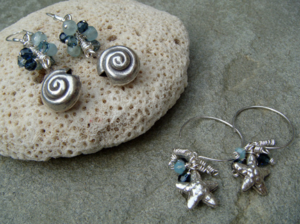Here are a pair of beach-themed earrings…they’ll go great with your favorite summer outfit. The starfish earrings are a new style for me. I saw the latest tutorial by a fabulous wire jewelry designer, Denise Perry, and decided to try a simplified version. The wire “doodles” were fun to make.