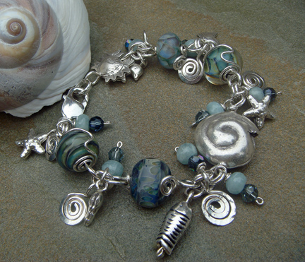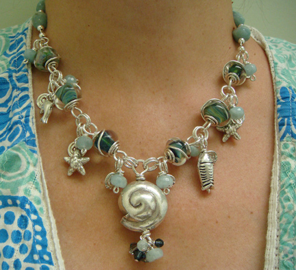 Here I am modeling the Ocean Treasures necklace….just had to show you how this over-the-top piece would look when worn. It has a string of aquamarine nuggets around the back, and a whole lot to show off up front! The boro glass is by Glitzy Glass Studios. It’s really like a charm bracelet necklace and will be sure to draw attention…..afterall, did you notice there’s even a tiny dolphin tucked in there!