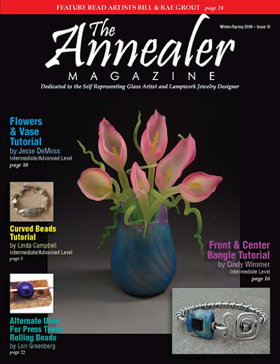 The Annealer is a specialty magazine created for lampwork artists and designers who incorporate hand made glass beads in their jewelry. I was psyched to see my bangle right there on the corner of the front cover! “Front and Center” is a wire bangle design that features a front clasp and a beautiful glass bead from Kerry Bogert of KAB’S Creative Concepts. I’ve added one of the pictured bangles in the sweet bead studio shop. You’ll see how different the bangles look depending on whether they are left shiny silver or if they’re oxidized.
