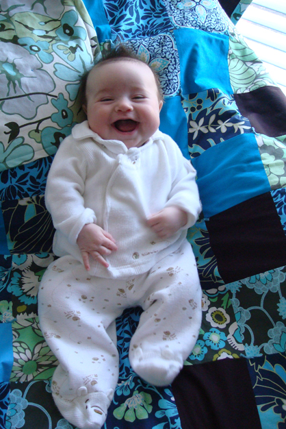 The next day I received another sweet gift, this time from my friend Kerry up in NY. She’s given me hints that she was up to something, making a little welcome gift for the baby. Boy was I surprised to open the box and find this beautiful crib quilt! She used Amy Butler fabric in some of my absolute favorite colors. She sure has a way of putting together patterns…it looks retro and modern at the same time. Thank you, Kerry!!! 🙂