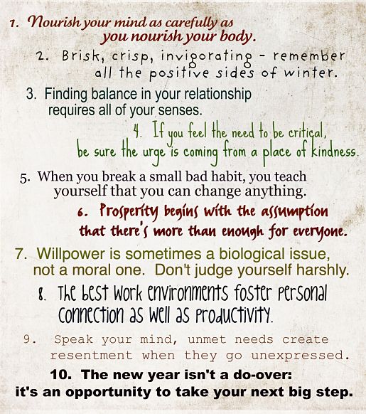 I’m looking forward to a new year and an new adventures around the corner. There’s nothing like a fresh start! Oh, and I found something I wanted to share, from the pages of my Whole Living magazine….. do any of these thoughts resonate with you? #10 is really calling to me! 🙂