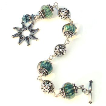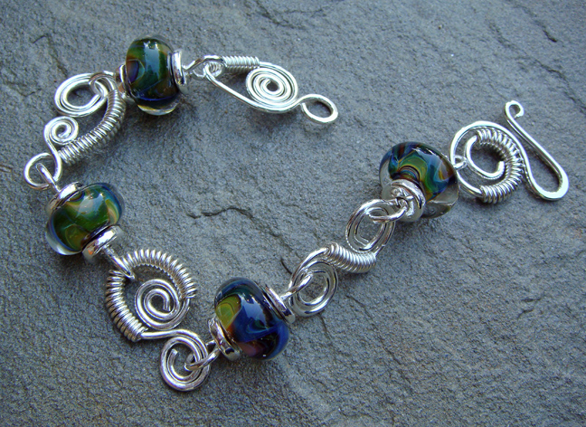I have a show and tell for you too. This wire bracelet is fresh from the studio and features boro beads by a talented Ohio lampwork artist. Daniel Echeverry’s beads were my first experience with borosilicate. If you are not already familiar with boro, I thought I’d fill you in with a very brief description. Lampwork bead artists work with many types of glass; “soft glass” is made from soda-lime, and “hard glass” which is borosilicate. Borosilicate glass requires a higher temperature to melt, and is known to be extremely strong and resistant to breaking. Laboratory test tubes, beakers, glassware (Bodum) and even some French coffee presses are made with borosilicate glass. There is a distinctive color-changing quality with boro beads. When you look at the beads in natural sunlight, you will see such incredible color and depth. The bracelet below is one of my first using boro beads.