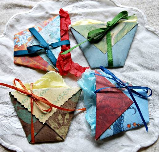 Not only was I in an earring-making kick lately, I also shopped for handmade earrings. I didn’t have to look long before Sandra Sculli’s beaded earrings caught my eye. And I wanted them in every color….I let my sister pick a pair and she picked the gold. Now I need to see if Sandra would make me another pair in gold ! If you have the gift of working with seed beads, you can purchase Sandra’s Cross Medallion tutorial on both Craftsy and Etsy. I just had to share pictures of Sandra’s origami-style packaging and her pretty earrings…